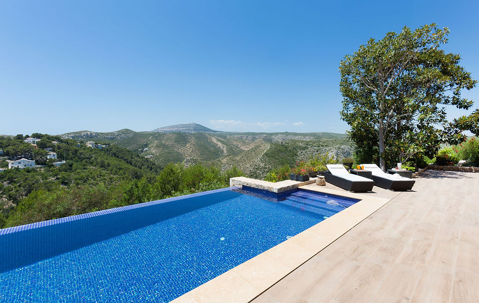 This is an elegant, contemporary jewel of Spanish architecture in a rural location with an expansive view of the hillsides, valleys and white villas in the distance, not to mention the Mediterranean Sea on the horizon. The striking architecture, surrounded by a picture book garden, with several magnificent examples of picturesque trees, exquisite natural stone walls, a stylish pool and a charming guesthouse, ascends sparklingly clean and like new on the extremely well-maintained plot.